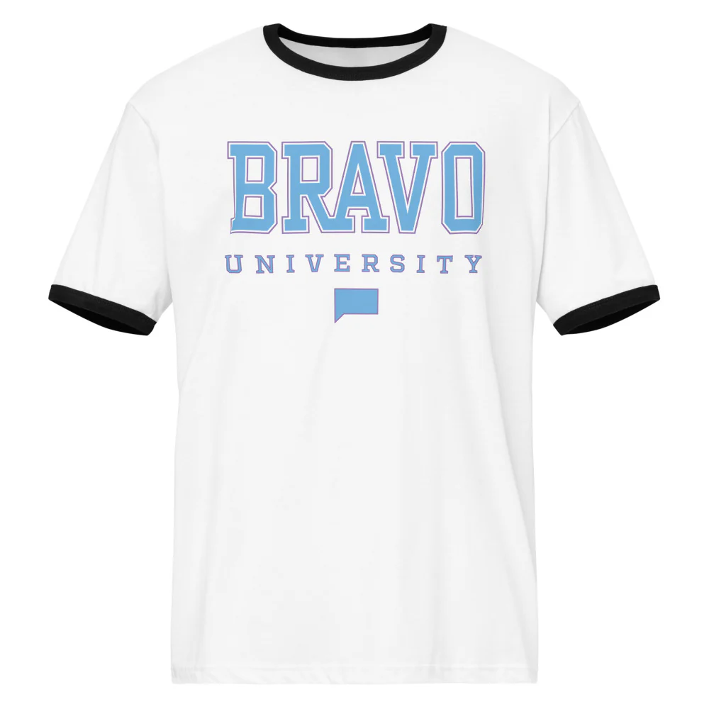 Show off your major in dramatic arts with the Bravo University Ringer T-Shirt! This tee features a cool, collegiate-inspired logo for Bravo University, making it the perfect uniform for attending classes in gossip and glamour. It's a must-have for every dedicated fan.